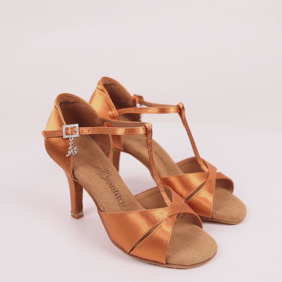 - DESIGN: Professional T-strap dance shoe featuring elegant satin upper and cross-strap design for secure fit during performances