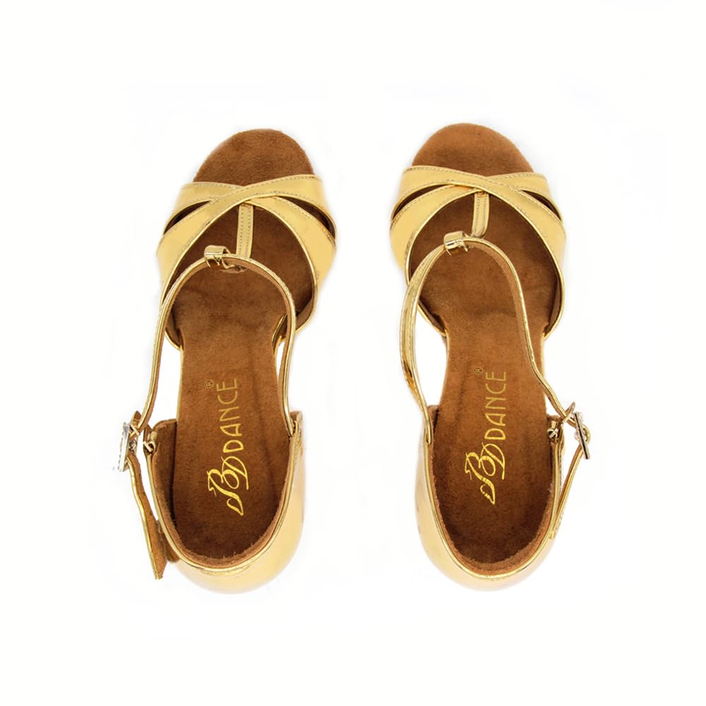 - DESIGN: Elegant gold metallic T-strap dance shoes with crystal-adorned buckle closure and open-toe design for maximum comfort and style